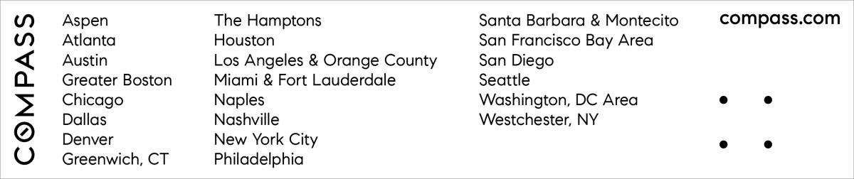 Compass is a real estate broker licensed by the State of California operating under multiple entities. License Numbers 01991628, 1527235, 1527365, 1356742, 1443761, 1997075, 1935359, 1961027, 1842987, 1869607, 1866771, 1527205, 1079009, 1272467. All material is intended for informational purposes only and is compiled from sources deemed reliable but is subject to errors, omissions, changes in price, condition, sale, or withdrawal without notice. No statement is made as to the accuracy of any description or measurements (including square footage). This is not intended to solicit property already listed. No financial or legal advice provided. Equal Housing Opportunity. Photos may be virtually staged or digitally enhanced and may not reflect actual property conditions.--